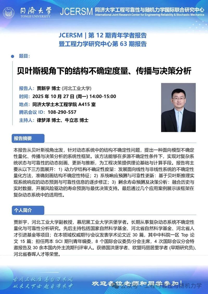 JCERSM | 第 12 期青年学者报告: Bayes 视角下的结构不确定度量传播与决策分析 | 报告人: 贾新宇